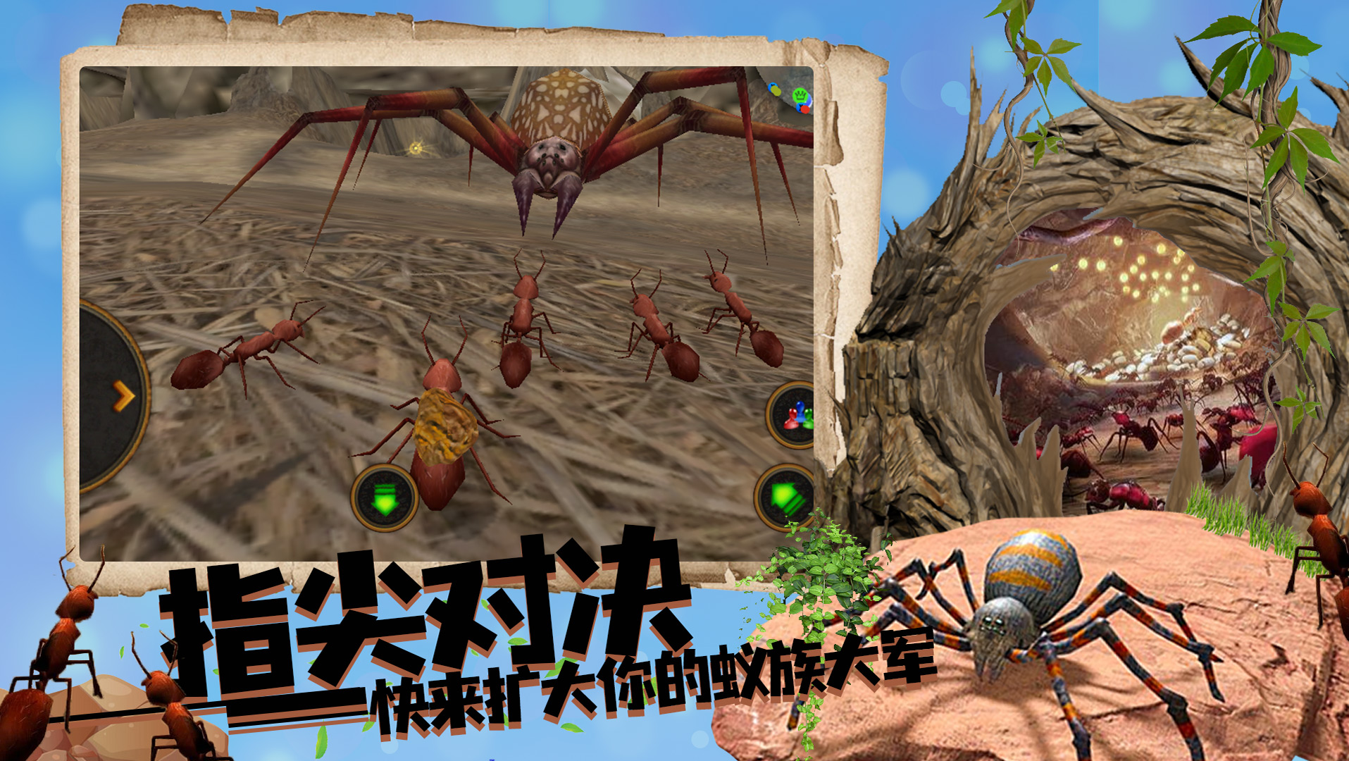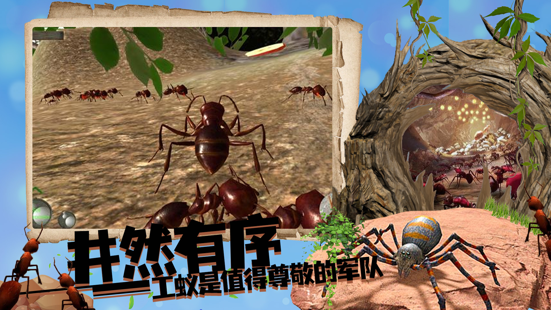 2、以火蚁的身份进入这一高度详细的3D昆虫世界,建立你的蚁群。找到足够的工蚁来建立你的蚁群。当你的殖民地足够大时,女王就会到来。你也会发现自己在与犀牛甲虫、瓢虫、螳螂、蜜蜂、蝎子和蜘蛛的对决中。