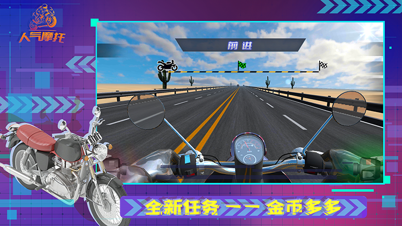 人气摩托是一款模拟竞速游戏,全力加速,驾驶摩托车疾驰在颠簸的公路上。开始享受超越猎豹的速度吧!人气摩托游戏里有玩法多样的三种游戏模式!继承传统摩托车赛车游戏简单暴'力玩法的同时,同时加入了职业模式、无尽模式和限时模式。